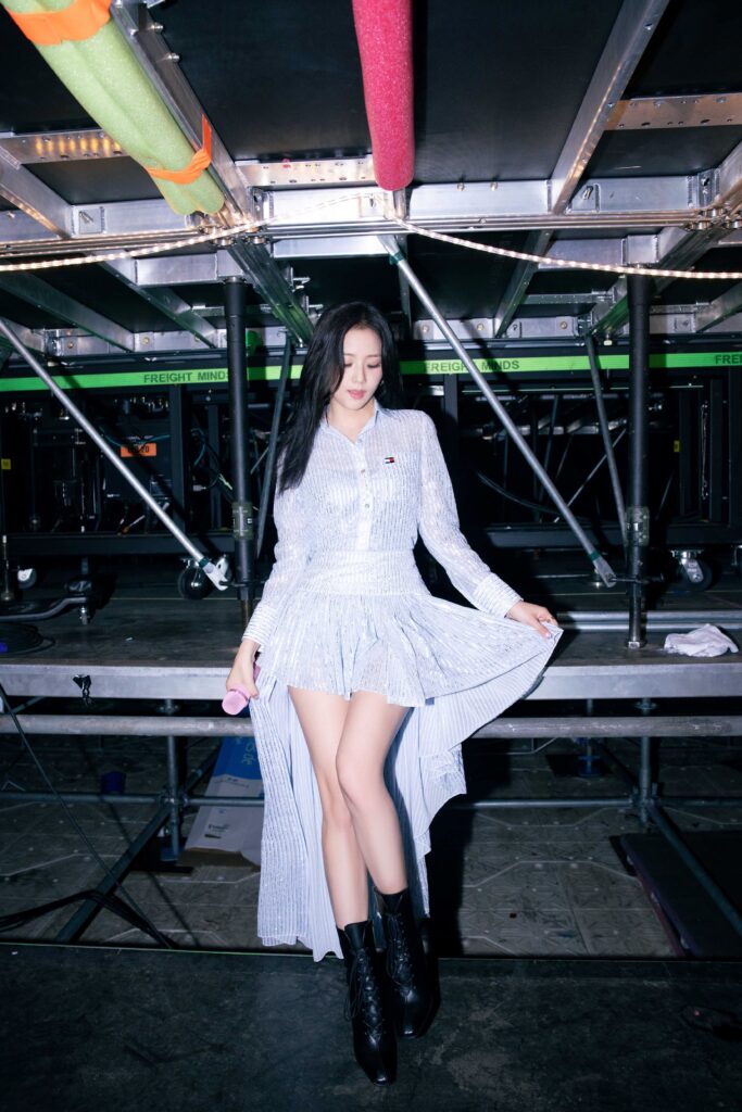Pe 27 Iulie, JISOO a revenit pe scena intr-o alta tinuta personalizata TOMMY HILFIGER constand intr-o rochie-camasa albastra cu alb Ithaca din sifon de matase opac, impodobita cu paiete si cristale aplicate manual — o interpretare rafinata a camasii clasice preppy TOMMY HILFIGER. Confectionata cu talie stransa si fusta maxi asimetrica infasurata, care se prelungeste intr-o coada spectaculoasa, tinuta creeaza o silueta moderna si impresionanta.