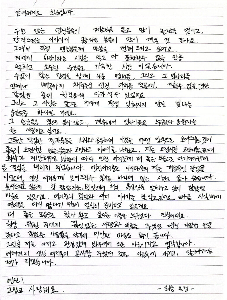 După anunțul oficial, Heeseung a publicat pe Weverse o scrisoare scrisă de mână pentru fani.