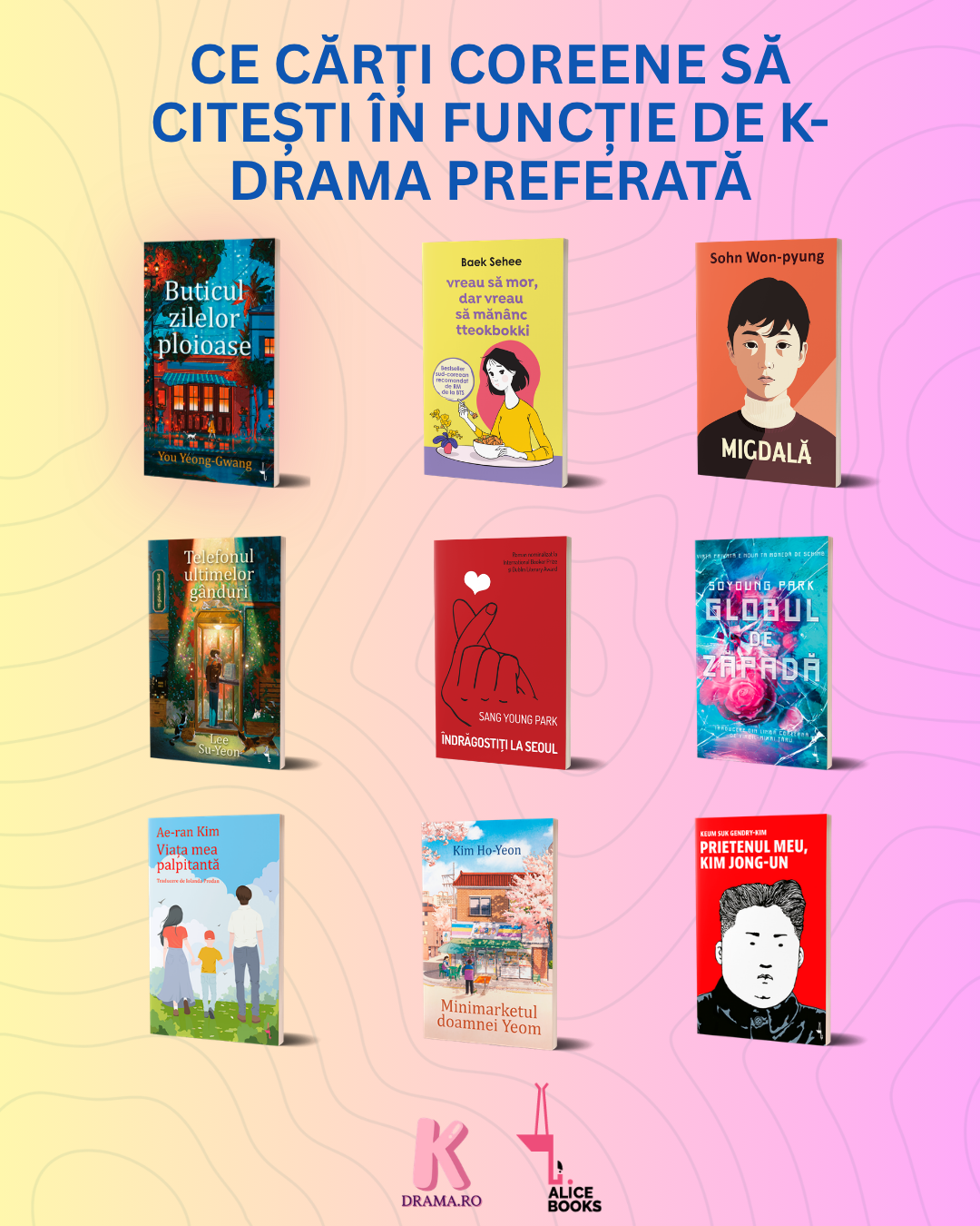 Dacă vrei să prelungești vibe-ul acestor seriale, selecția de cărți coreene de la Alice Books e exact ce trebuie. Iată câteva recomandări în funcție de tipul de K-drama pe care îl iubești: